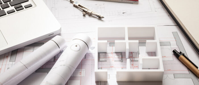 Architect engineer office desk. Blueprint plans and house model, Residential building project architectural design