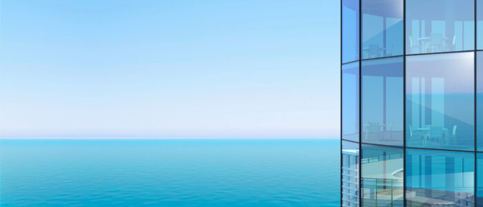 3d illustration. Facade of a skyscraper and sea view. Modern office or hotel in a metropolis