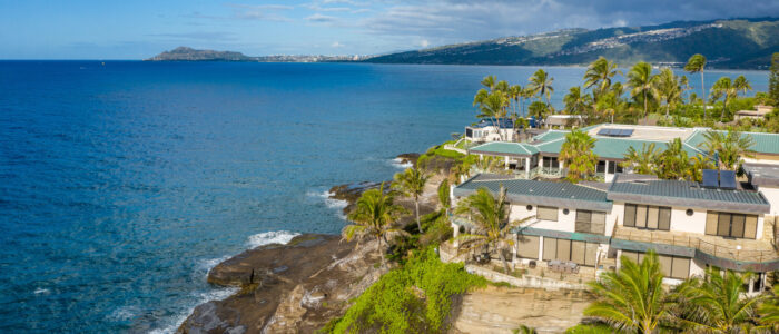 Aerial view of expensive cliff top houses at Portlock overlooking the ocean in Oahu, Hawaii