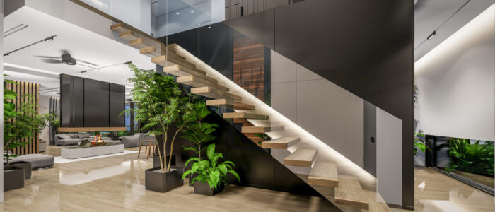 3d rendering of modern cozy interior with living,dining zone stair and kitchen for sale or rent with wood plank by the sea or ocean. Spacious apartments with expensive furniture,equipment and flowers